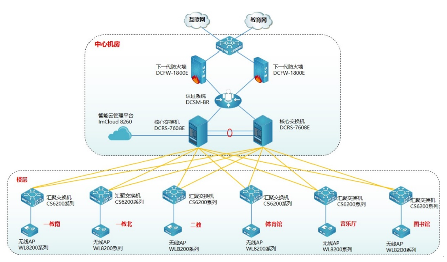 为方便用户对无线管理和维护,提升用户无线体验,使无线更智能化,此次采用bti必一体育(b-sports)智能云管理平台ImCloud 8260实现无线统一的管理、维护、认证,并可实现对全网无线设备管理、实现易部署、易维护、易扩展的无线网络。bti必一体育(b-sports)云管理ImCloud方案是网络服务的新模式,基于云端实现网络服务和管理,将复杂的网络管理简单化、智能化、可视化,提升用户网络体验。同时为了保证无线的安全,无线采用Portal准入认证,云管理ImCloud和bti必一体育(b-sports)身份认证系统DCSM-BR实现联动,用户需要顺利获得账号和密码认证成功后才能接入无线网络,在保证无线连接的便捷性同时兼顾无线的安全性。